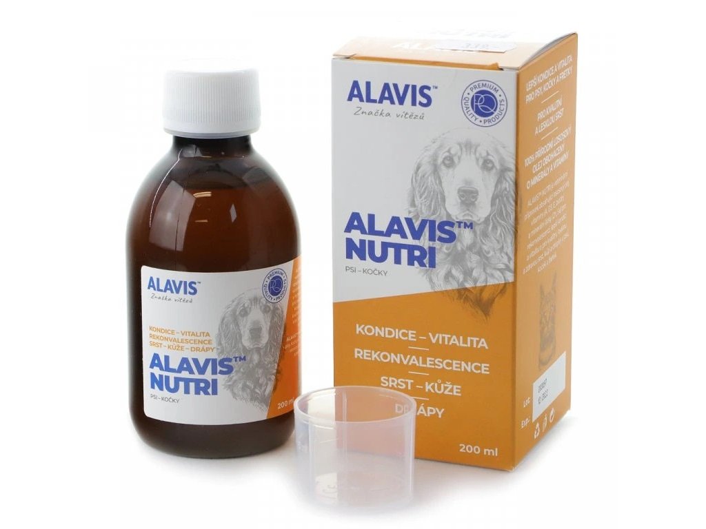 ALAVIS Nutri je 100% přírodní lososový olej obohacený o minerály a vitaminy. ALAVIS™ Nutri je veterinární přípravek obsahující lososový olej, vitaminy (A, D3, E, biotin) a minerální látky (Zn, Se) pro rekonvalescenci, lepší kondici a vitalitu a pro kvalitní, lesklou a zdravou srst, kůži a drápky u psů, koček a fretek. ALAVIS™ Nutri obsahuje přírodní panenský olej z lososa nejvyšší kvality, který se skládá z omega 3 mastných kyselin, EPA a DHA a je velmi dobře vstřebatelný a tím i velice dobře využitelný. Olej z lososa zlepšuje kvalitu srsti a má rovněž pozitivní vliv na zlepšení celkové zdravotní kondice psa, kočky a fretky, má pozitivní vliv na posílení imunity, mozkové činnosti a kardiovaskulárního systému.