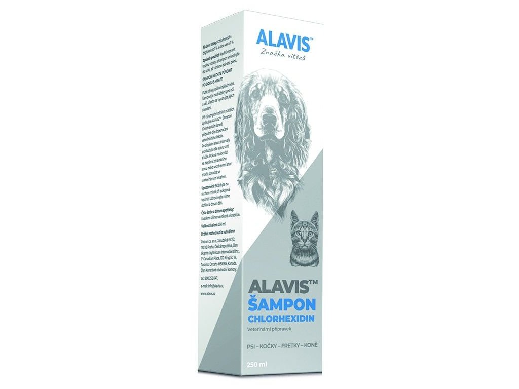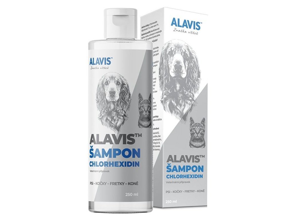ALAVIS Šampon Chlorhexidin je šampon pro zevní péči o srst a kůži psů, koček, fretek a koní obohacený o složku chlorhexidinu, která pomáhá snížit výskyt nežádoucích mikroorganismů a Aloe vera, jenž vykazuje protizánětlivý účinek, napomáhá rychlejšímu hojení poranění a podporuje tak účinek šamponu.