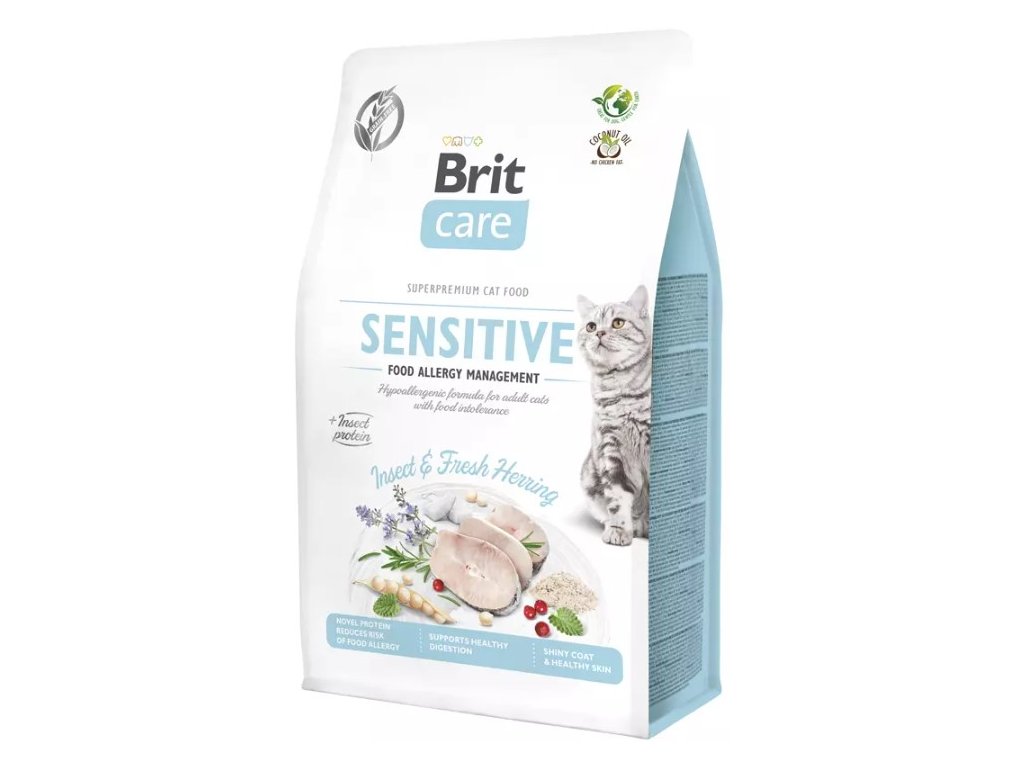 Kompletní krmivo pro dospělé kočky. Bezobilná hypoalergenní receptura pro kočky s potravinovou intolerancí. Bohatá na Omega-3 a Omega-6 mastné kyseliny pro zdravou kůži a lesklou srst. Hmyzí protein podporuje zdravé trávení a snižuje riziko potravinových alergií. Nový udržitelný zdroj proteinu s nízkou uhlíkovou stopou. Složení:čerstvý sleď (26 %), žlutý hrách (23 %), dehydrovaný sleď (20 %), dehydrovaný hmyz (14 %), kokosový olej (konzervovaný tokoferoly, 8 %), olej ze sleďů (2 %), přírodní chuť hydrolyzovaných jater (2 %), sušená jablka (2 %), lněné semínko (1 %), sušený srdečník (0,5 %), sušený heřmánek (0,5 %), hrachová mouka, sušený rakytník řešetlákový (0,3 %), sušené brusinky (0,2 %), frukto-oligosacharidy (0,015 %), mannan-oligosacharidy (0,015 %), juka schidigera (0,008 %), Lactobacillus acidophilus HA – 122 inaktivováno (15x109 buněk/kg). Analytické složky:hrubý protein 34,0 %, hrubý tuk 16,0 %, hrubá vláknina 1,2 %, hrubý popel 8,2 %, vlhkost 10,0 %, omega-3 mastné kyseliny 0,8 %, omega-6 mastné kyseliny 2,2 %, vápník 1,1 %, fosfor 0,8 %, sodík 1,0 %, hořčík 0,1 %. Nutriční složení:vitamín A (3a672a) 20000 IU, vitamín D3 (3a671) 800 IU, vitamín E (3a700) 600 mg, vitamín C (3a312) 300 mg, taurin (3a370) 2500 mg, L-karnitin (3a910) 50 mg, cholinchlorid (3a890) 2500 mg, biotin (3a880) 2 mg, vitamín B1 (3a821) 10 mg, vitamín B2 (3a825i) 12 mg, niacinamid (3a315) 50 mg, D-pantothenan vápenatý (3a841) 40 mg, vitamín B6 (3a831) 10 mg, kyselina listová (3a316) 2 mg, vitamín B12 0,04 mg, zinek (3b606) 120 mg, železo (3b106) 45 mg, mangan (3b504) 55 mg, jodid draselný (3b201) 4 mg, měď (3b406) 10 mg, selen (3b810) 0,2 mg, L-methionin 2000 mg. Obsahuje přírodní antioxidanty schválené EU: tokoferolové extrakty z rostlinných olejů (1b306(i)), askorbyl-palmitát (1b304) a výtažek z rozmarýnu. Metabolizovatelná energie: 3,860 kcal/kg