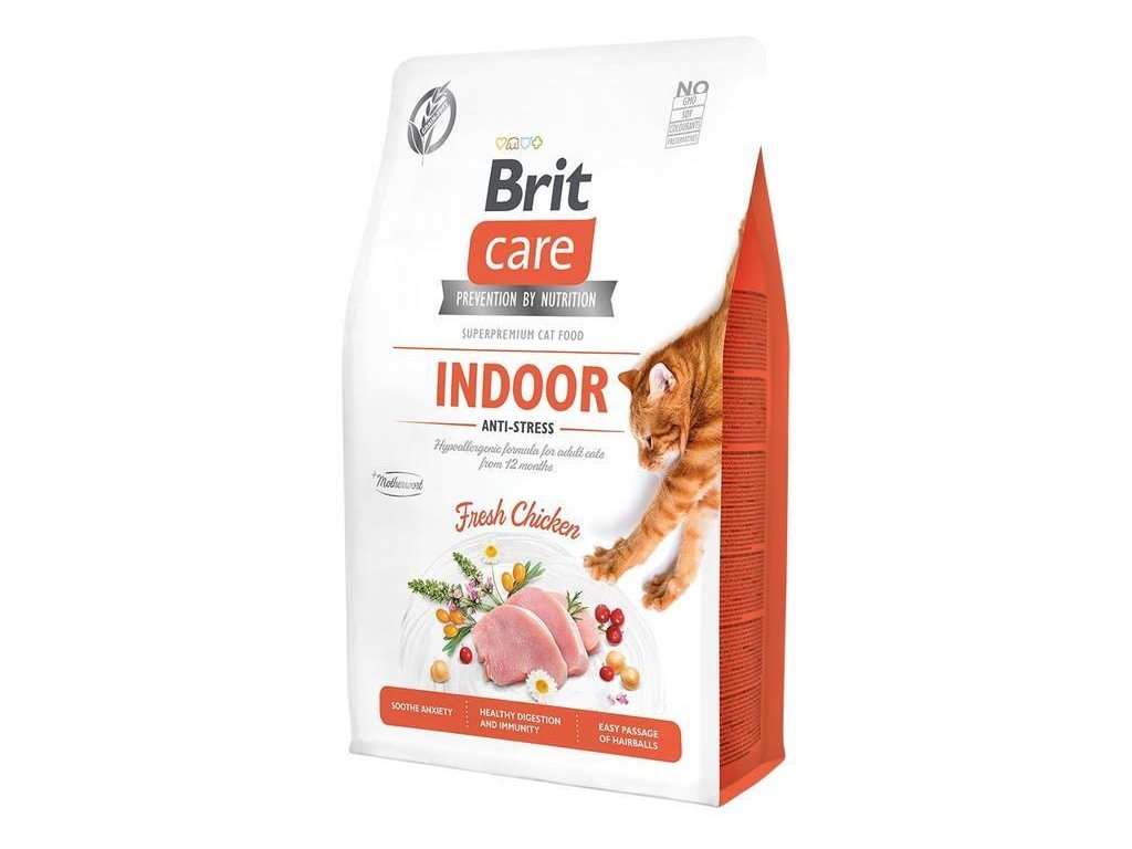 Brit Care Cat Grain-Free Indoor Anti-stress je kompletní krmivo pro všechny dospělé kočky od 12 měsíců věku od 12 měsíců žijící převážně v domácnosti. Receptura obsahuje čerstvé kuřecí maso a je zcela bez obsahu obilovin.