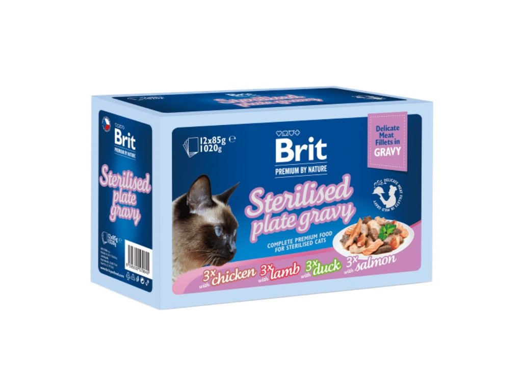 Brit Premium filety s jehněčím ve šťávě pro kastrované kočky: 82 % maso a vedlejší výrobky živočišného původu ve filetech (8 % jehněčí), vedlejší výrobky rostlinného původu (0,4 % inulin), minerální látky.