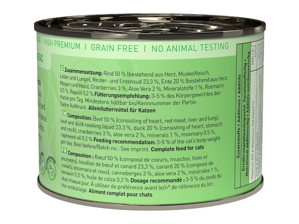 Lahodná konzerva pro kočky, která obsahuje vysoký podíl hovězího a kachního masa, zdraví prospěšné brusinky a aloe vera. Konzervy Catz finefood obsahují pouze suroviny vysoké potravinářské kvality a svým složením odpovídají přirozené kočičí stravě. Jsou bez konzervantů, umělých barviv a dochucovadel. Konzervy neobsahují geneticky upravené suroviny. Jedná se o kompletní krmivo.