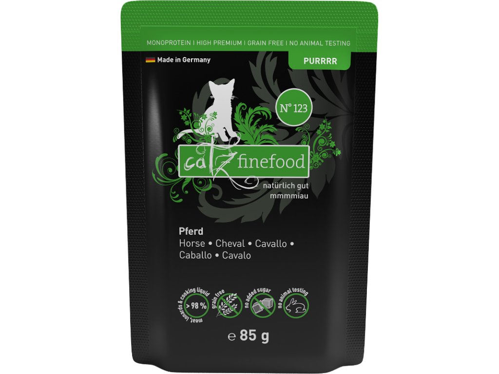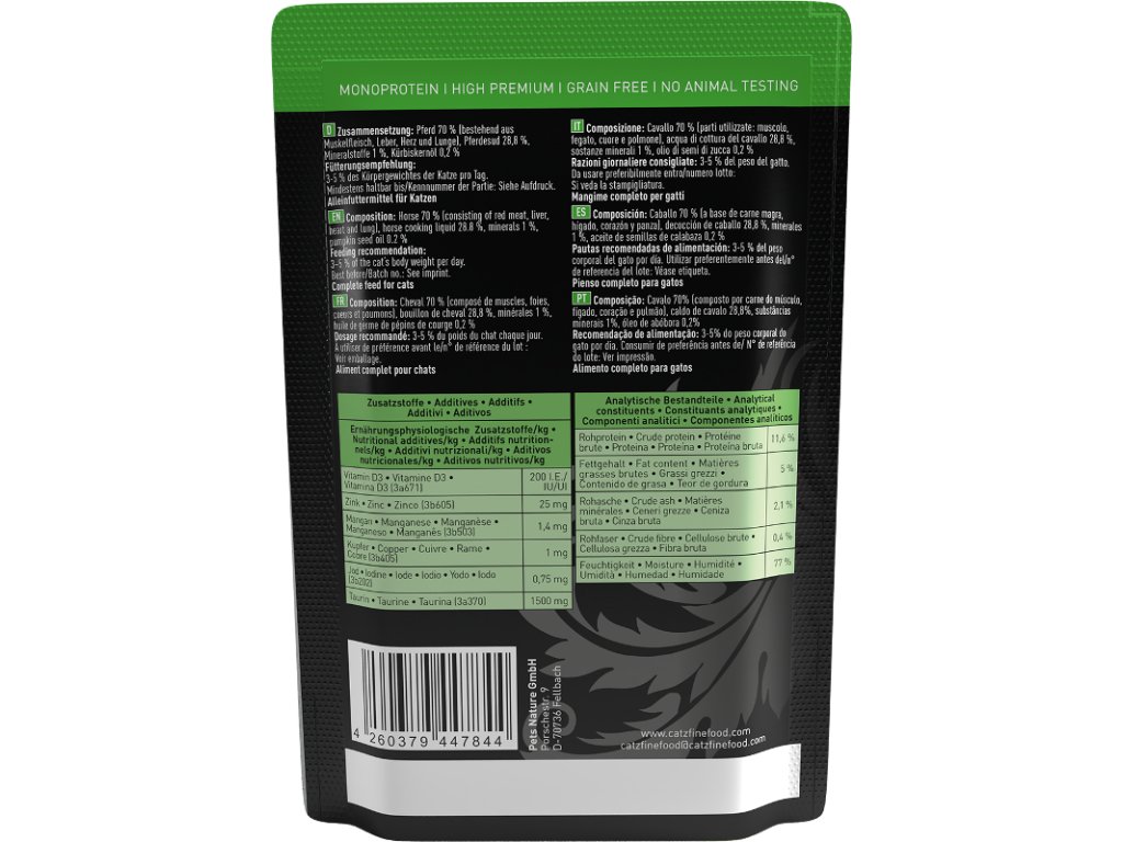 Excelentní kapsička pro kočky, která obsahuje pouze koňské maso, vnitřnosti a vývar, minerální látky a dýňový olej. Je proto vhodná i pro kočky s citlivým zažíváním nebo alergiky. Jedná se o kompletní monoproteinové krmivo pro kočky všech věkových kategorií a plemen.