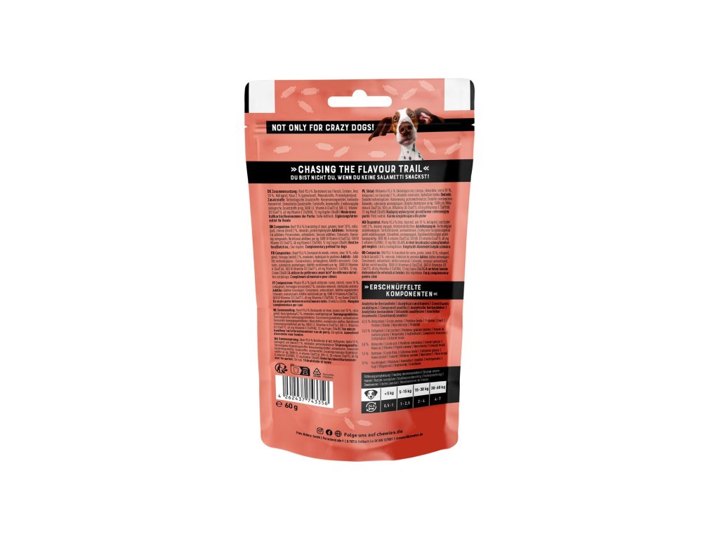 Chewies Salametti Hovězí maso, srdce a sýr 60 gSalametti jsou měkké pamlsky s intenzivní chutí a vůní opravdového salámu, kterým žádný pes neodolá!