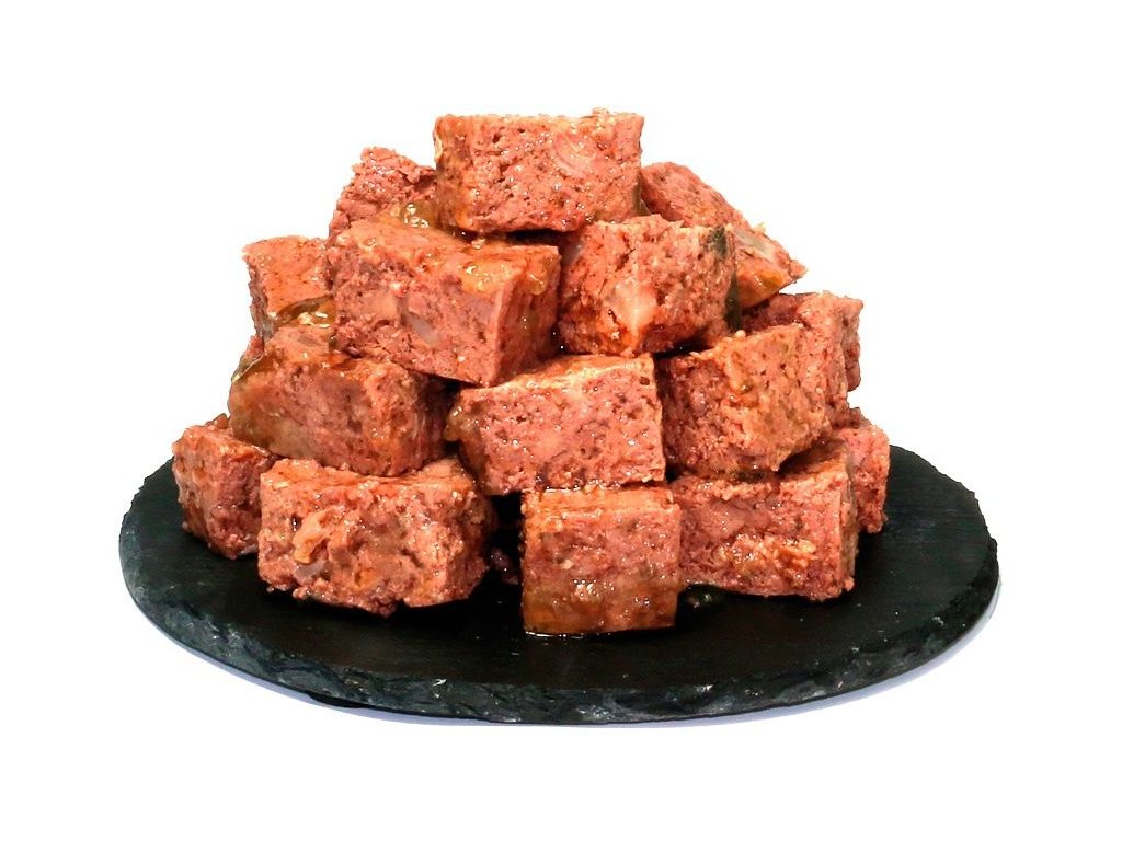 70 % směs: krůtí srdce, krůtí maso, krůtí játra, krůtí krky, 29 % vývar, 1 % minerály.