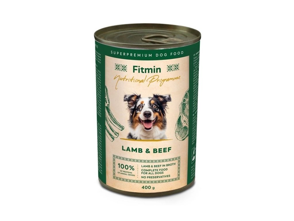 Kompletní mokré krmivo pro dospělé psy všech plemen z řady Fitmin Výživový program je vyrobeno z čerstvého masa. Krmivo je vhodné i pro štěňata a mladé psy. Lahodné krmivo je vhodné na ochucení granulí nebo za odměnu do misky. Masová konzerva s jehněčím a hovězím masem je vhodná pro malé i velké mlsné psy. Mokré krmivo Fitmin Výživový program je bez obilovin, bez GMO a neobsahují žádná barviva, umělé konzervační látky a dochucovadla.