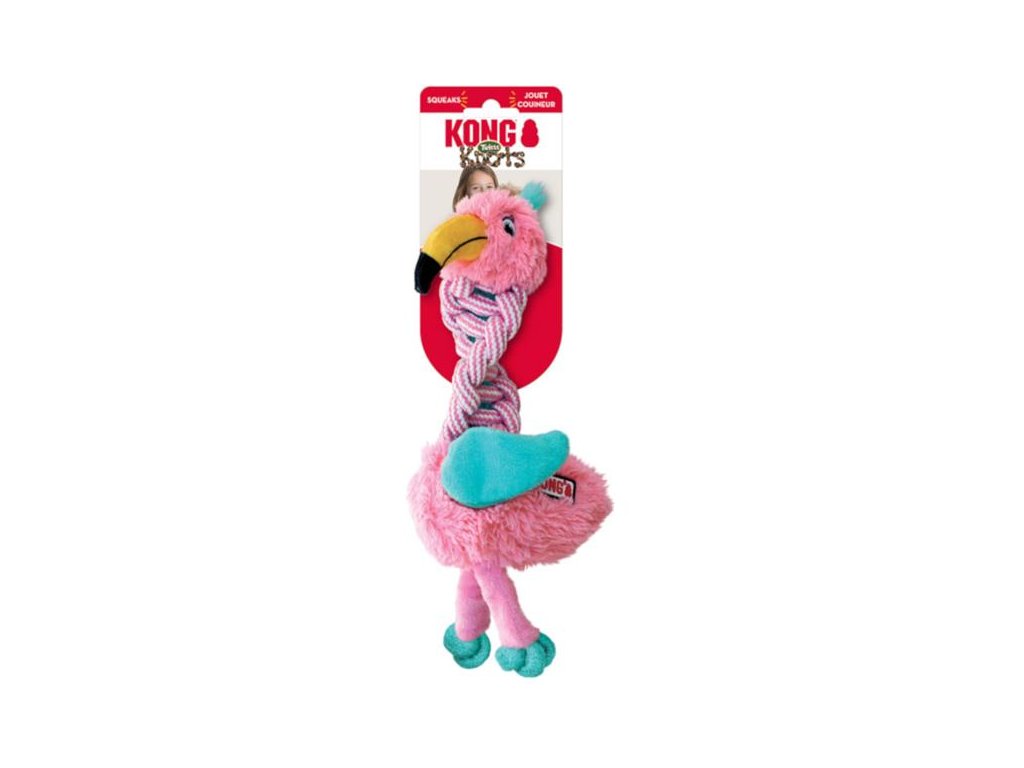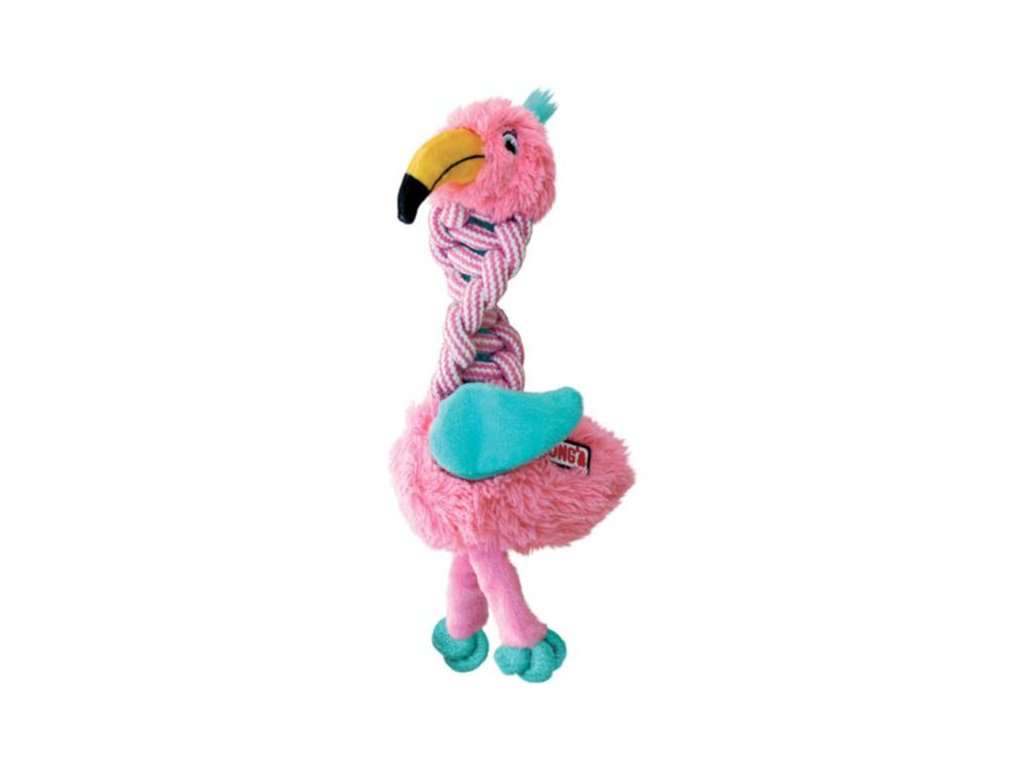 Roztomilá barevná hračka pro psy KONG Knots Twists je plameňák/žirafa vyrobené z různorodých materiálů, který podněcuje přirozené psí instinkty a tříbí jejich smysly. Dlouhý pohyblivý provazový krk, kolem něhož se ve spirále ozdobně obtáčí silné bavlněné lanko, láká k okusování, třepání a drancování.