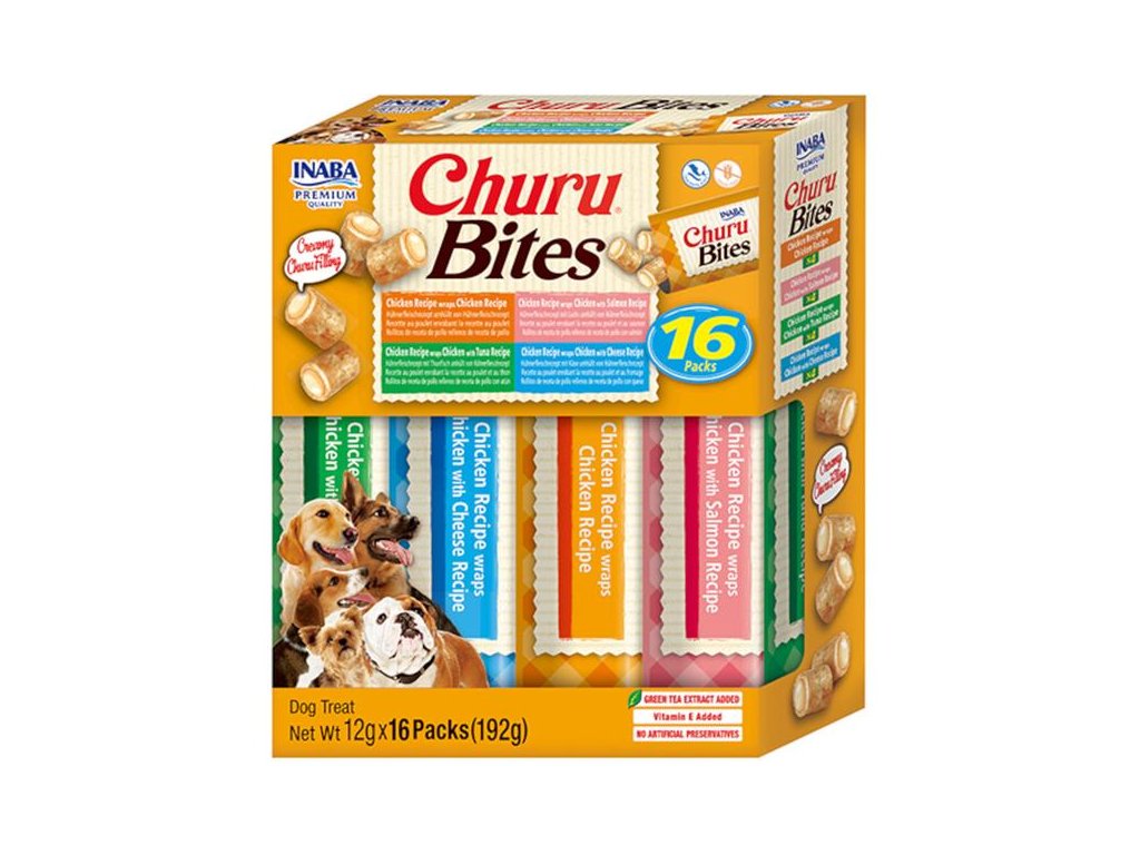 Churu Bites jsou šťavnaté, krémové a extra lahodné pamlsky ve tvaru polštářků plněných masovým pyré s kuřecím z farmářského chovu. Inovativní měkká konzistence pamlsků vám umožní trávit společné chvíle s vaším psem hravým a interaktivním způsobem. Pamlsky jsou 100% přírodní, nízkokalorické, bez obilovin (grain-free), bez přidaných konzervantů, umělých dochucovadel a barviv. Jsou také ideální pro ukrytí tablety na odčervení či jiného léku, který je potřeba psovi nenásilně podat.Balení obsahuje 4× kuřecí recepturu, 4× kuře s tuňákem, 4× kuře s lososem a 4× kuře se sýrem.