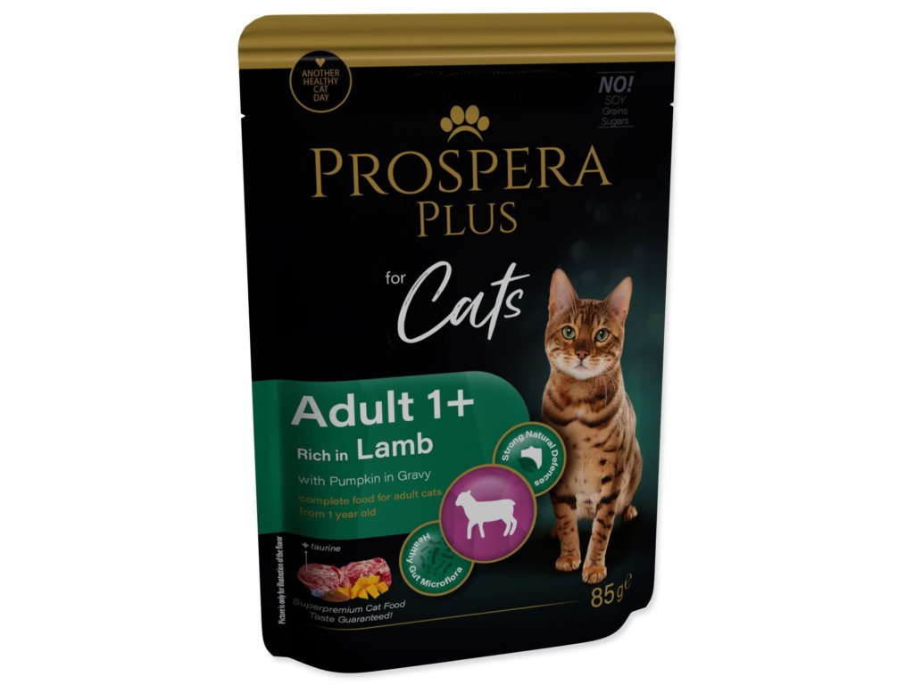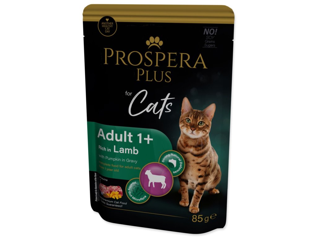 Kompletní krmivo pro kočky od 1 roku v podobě kapsičky s jehněčím a dýní v omáčce.