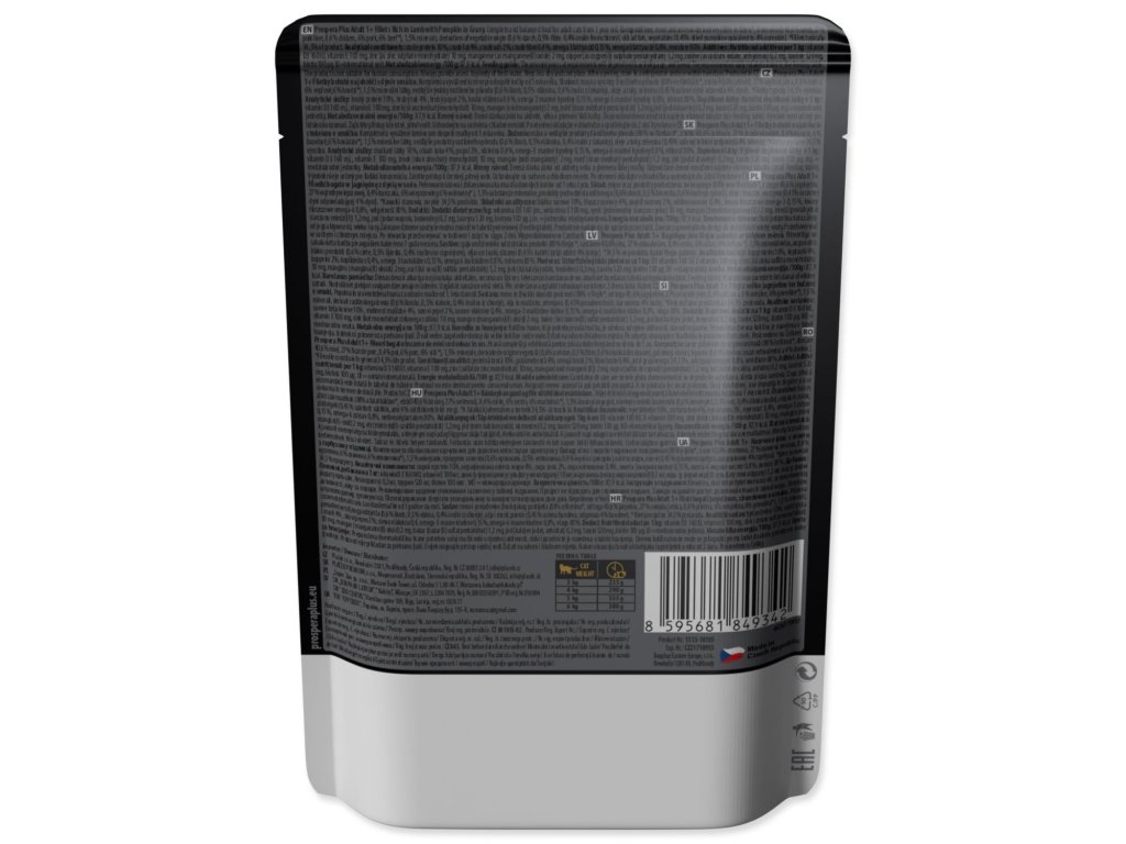 Analytické složky: Hrubý protein 10%, hrubý tuk 4%, hrubý popel 2%, hrubá vláknina 0,4%, omega 3 mastné kyseliny 0,15%, omega 6 mastné kyseliny 0,8%, vlhkost 80%.