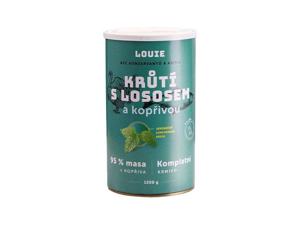 Složení: 95 % masa (krůtí, losos), kopřiva.
