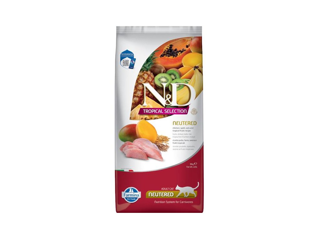 Kompletní nízkoobilné krmivo s kuřecím masem a tropickým ovocem pro dospělé kastrované kočky. Řada N&D Tropical selection v sobě kombinuje kvalitní zdroje živočišných bílkovin, vysoce kvalitní obiloviny a chutné tropické ovoce pro nasycení vašeho zvířecího kamaráda.Granule řady Tropical selection navazují na řadu nízkoobilných krmiv Ancestral Grain, v nichž je maso doplněno ovsem a špaldou. Tyto „staré obilniny“ se vyznačují nízkým glykemickým indexem a tím prodlužují dobu sytosti. Chutnost krmiva zvyšuje přidané tropické ovoce, jako je papája, mango, kiwi, ananas a banán, bohaté na přírodní antioxidanty a vitamíny.