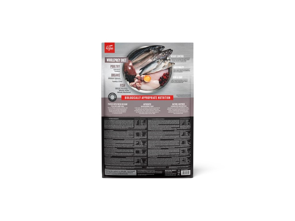 Čerstvé kuřecí maso (20 %), čerstvé kuřecí droby (játra, srdce) (11 %), celý syrový sleď (8 %), syrová krůta (6 %), celý syrový hejk (5 %), čerstvá vejce (5 %), celá syrová makrela (4 %), dehydrované kuřecí maso (4 %), dehydrované krůtí maso (4 %), dehydrovaná makrela (4 %), dehydrovaná sardinka (3 %), dehydrovaný sleď (3 %), dehydrovaný síh (3 %), syrová krůtí játra (3 %), vláknina z čočky, celá červená čočka, celá zelená čočka, celý hrách, celá cizrna, celé fazole pinto, hráškový škrob, celé fazole navy, dehydrovaná treska modravá (1 %), kuřecí tuk (1 %), jablečná vláknina, sušená řasa, řasy (zdroj EPA a DHA), celá čerstvá dýně, čerstvá celá máslová dýně, čerstvá celá cuketa, čerstvá celá mrkev, celá čerstvá jablka, celé čerstvé hrušky, sušený kořen čekanky, čerstvá kapusta, čerstvý špenát, čerstvé listy červené řepy, čerstvé listy tuřínu, celé brusinky, celé borůvky, celé plody muchovníku, kurkuma, ostropestřec, kořen lopuchu, levandule, kořen ibišku, šípky.
