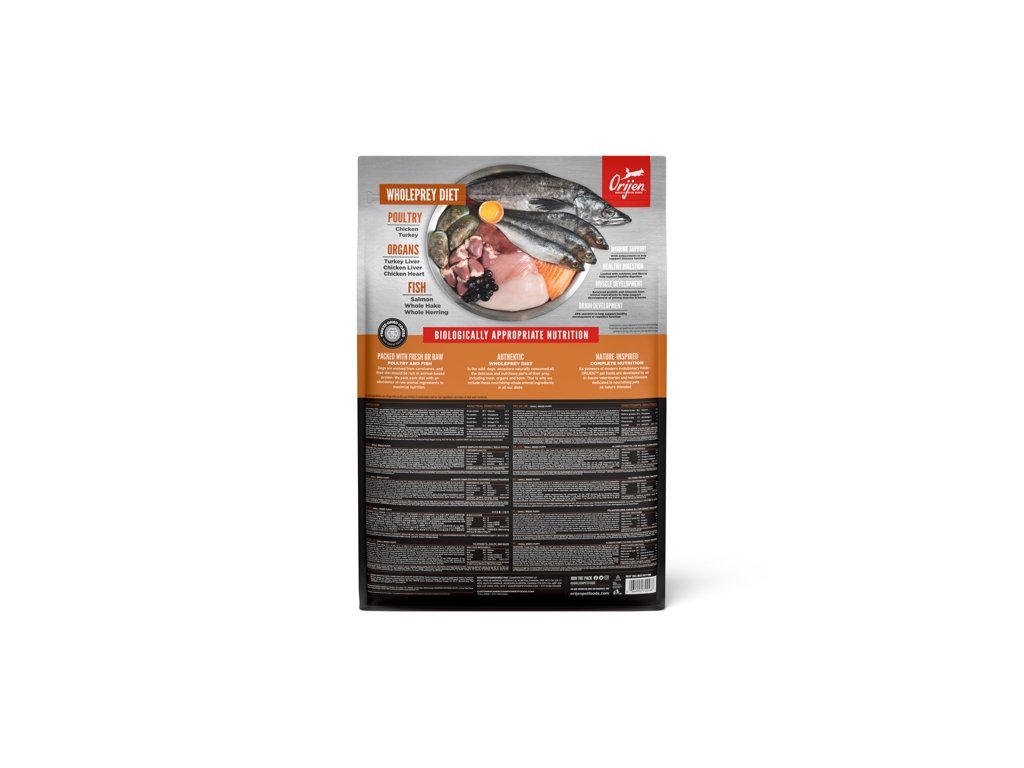 Složení: Čerstvé kuřecí (18 %), syrový losos (12 %), syrové krůtí (10 %), celý syrový hejk (4 %), celý syrový sleď (4 %), syrová krůtí játra (4 %), čerstvé kuřecí droby (játra, srdce) (4 %), čerstvá vejce (4 %), dehydrované krůtí (4 %), dehydrované kuřecí (4 %), dehydrovaný sleď (4 %), dehydrovaná kuřecí játra (4 %), dehydrovaná vejce (4 %), celá červená čočka, celé fazole pinto, kuřecí tuk (3 %), celá zelená čočka, celé fazole navy, celá cizrna, celý hrách, olej z tresky (2 %), vláknina z čočky, syrová slávka zelenoústá, sušená mořská řasa, celá čerstvá máslová dýně, celá čerstvá dýně, sůl, sušený kořen čekanky, celá čerstvá jablka, celá čerstvá mrkev, celé čerstvé hrušky, celá čerstvá cuketa, čerstvé mladé listy červené řepy, čerstvá kapusta, čerstvý špenát, čerstvé listy tuřínu, celé brusinky, celé borůvky, celé plody muchovníku olšolistého, kurkuma, ostropestřec mariánský, kořen lopuchu, levandule, kořen proskurníku, šípky.