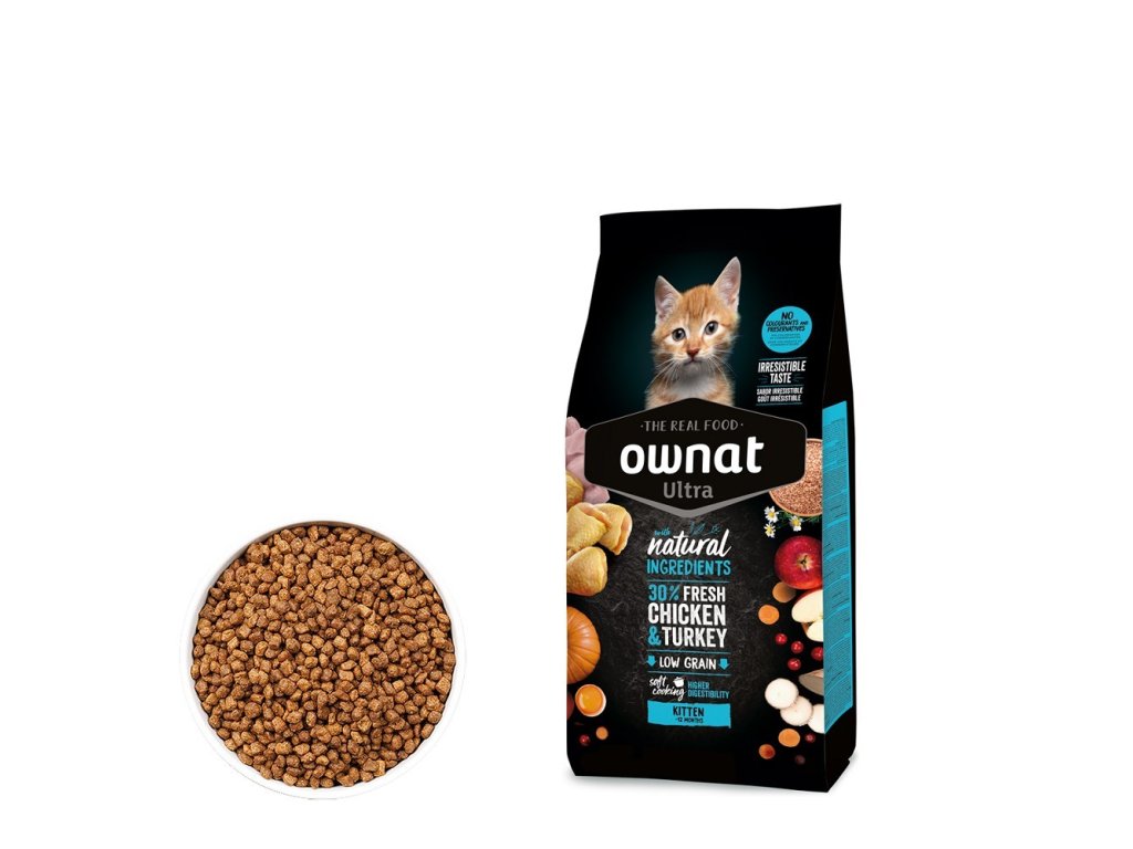 Ownat Ultra Kitten bylo vyvinuto speciálně pro výživové potřeby koťat od odstavu do jednoho roku věku. Obsahuje 30 % čerstvého masa z kuřete a krůty, doplněného o kvalitní rybí proteiny z lososa, které zajišťují vysoký obsah bílkovin a podporují zdravý růst a vývoj svalstva. Lososový olej bohatý na DHA napomáhá správnému vývoji mozku a zraku.