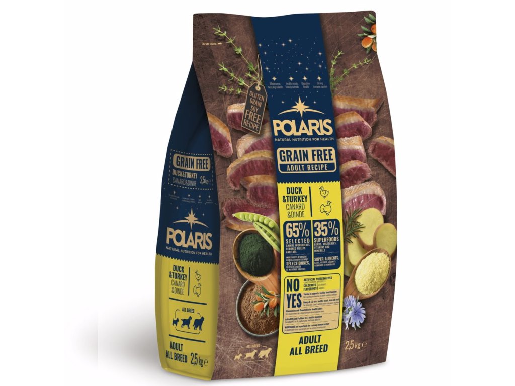 Složení: Vykostěná kachna (25 %), bramborové vločky (20 %), sušená krůta (18 %), hrách (12 %), sušené vepřové (11 %), bramborový škrob, drůbeží tuk, sušené řepné řízky (4 %), hydrolyzovaná živočišná bílkovina, kvasnice (3 %), sušená čekanka (2,5 %), vitaminy a minerály, lososový olej (0,5 %), psyllium (0,5 %), Extrakt z yuccy schidigery (0,2 %), spirulina (0,2 %), ActiveMOS (0,2 %), MACROGARD (0,1 %), rakytník (0,1 %), bylinky (rozmarýn, tymián, petržel, 0,1 %), chondroitin sulfát (270 mg / kg), glukosamin sulfát (200 mg / kg).
