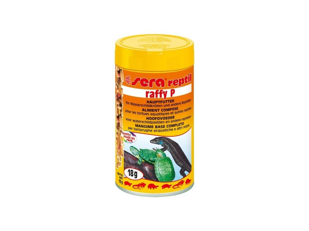 Sera Raffy P je přírodní krmivo pro vodní želvy. Chutné plovoucí krmné tyčinky jsou ideální pro denní krmení. Šetrně vyrobený granulát obsahuje směs vodních a rostlinných složek. Ideální i pro starší vodní želvy, které dávají ve své výživě přednost rostlinným složkám. Podporuje zdravý vývoj a vitalitu.
