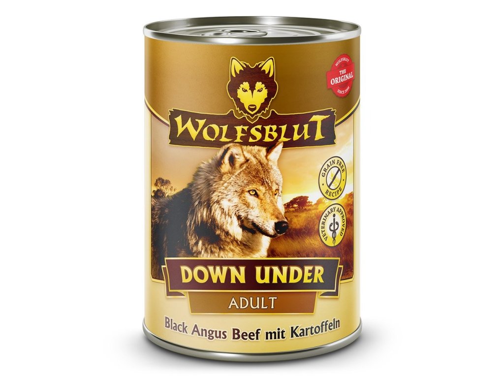 Vlci loví svou kořist od Skalistých hor Severní Ameriky, arktické tundry, hor a lesů Evropy až po pouště a stepi střední Asie. To jim dodává maso a vnitřnosti bohaté na živiny, ale také zeleninu, ovoce, bobule, kořeny a bylinky z obsahu žaludku kořisti. Obilí zde není zahrnuto. Vlk tak přijímá potřebné vitamíny, minerály, stopové prvky, enzymy a druhotné rostlinné látky. Vzhledem k tomu, že vlk je předkem všech psů, naše mokré krmivo Wolfsblut je založeno na přirozených stravovacích návycích vlka. Obsahuje hodně masa nebo ryb v kombinaci se superpotravinami, které obsahují hodnotné ingredience – stejně jako v přírodě, bez obilovin. Náš výběr výjimečných druhů masa a superpotravin bohatých na živiny vychází z vlčích biotopů a jejich pestré stravy. Wolfsblut nabízí každému psovi druhově vhodnou a originální stravu a díky rozmanitosti odrůd si každý najde něco, co snese. Jednotlivé složky potravy DOWN UNDER byly sestaveny společně s veterináři tak, aby vyhovovaly přirozenému chování vlka kořisti a poznatkům o holistické výživě psů. Mokré krmivo Wolfsblut je jedinečné a obsahuje mnoho superpotravin.
